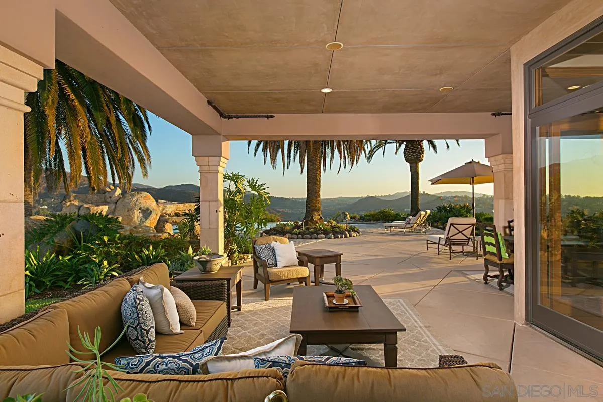 Bryce Point Estate is THE Ultimate View Property! A 2-story Mediterranean hilltop masterpiece in the guard gated community of The Heritage Custom Estates. Located at the end of a private cul-de-sac, perched high above Maderas Golf Course with breathtaking views all around. This custom home features amenities found in a luxurious resort. Finished with tumbled travertine, marble, hardwood flooring, crown moulding, granite countertops, immense stone fireplaces, water filtration system and whole house & pool solar, this home is designed with every detail in mind. The gourmet chef's kitchen boasts an expansive granite island and opens into a spacious family room with stone fireplace, vaulted wood ceiling and entertainer's wet bar with walk in wine cellar. Rejuvenate in the dedicated Wellness Center with gym/yoga/cardio/weight studio, locker room with steam sauna, hydrotherapy tub with waterfall, hot dry sauna and shower. Stream sports events and movies in the private cinema room with state-of-the-art sound system. The beauty of this estate extends outdoors to the large, covered veranda with living room, dining area and outdoor kitchen overlooking the lushly landscaped grounds. Further enhancing the outdoors is a vanishing edge saltwater pool with bench seating, waterfall, sit in grotto, slide, extra deep end with diving ledge and outdoor heated jetted spa. Enjoy playing sports on the sport court and large flat grassy areas. BONUS FEATURE: This estate offers a private 1-bedroom suite with living room, kitchenette and fireplace perfect for nanny or multi-generational.