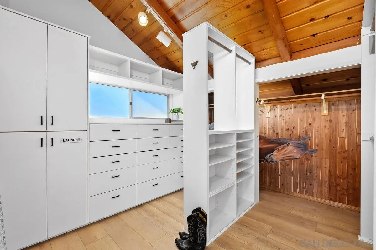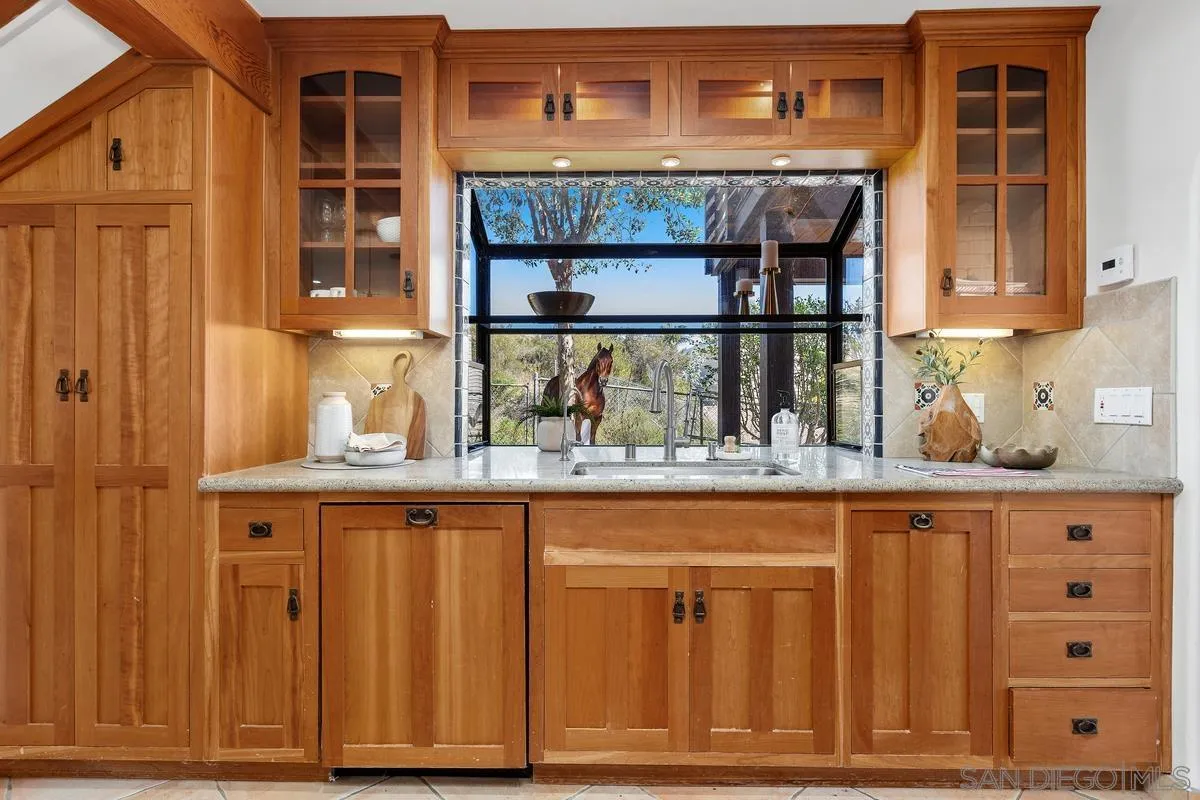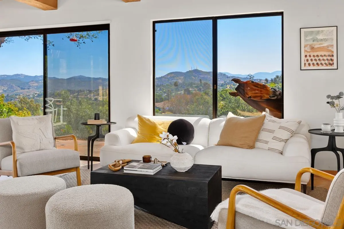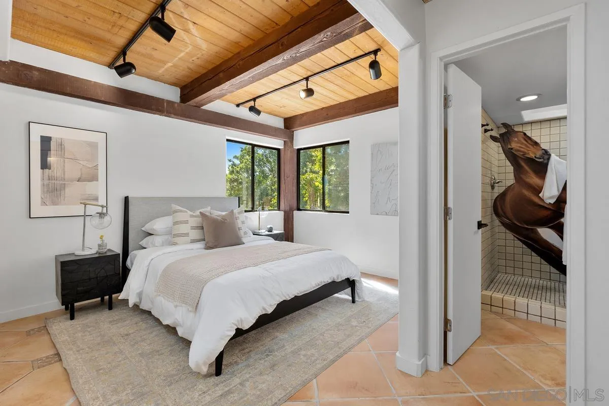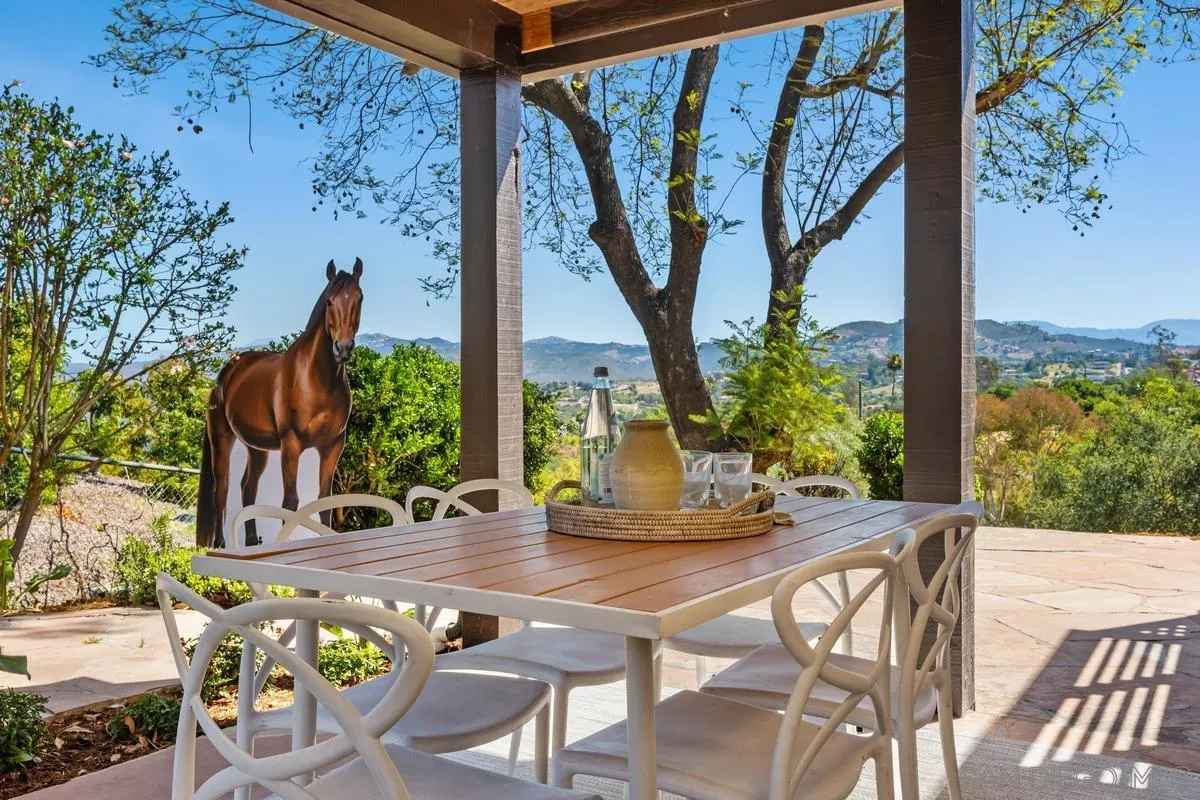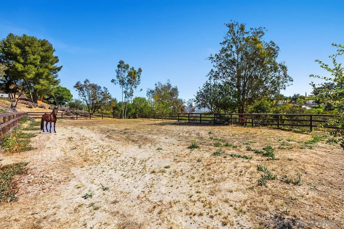 4.4-acre gated horse property with panoramic views, usable land, and a complete equestrian setup just minutes from downtown Fallbrook. This solar-powered 3BR/2BA home is designed to take advantage of the setting, with large picture windows, exposed beam ceilings, and seamless indoor-outdoor flow to an expansive view deck. The main living space centers around a fireplace and connects to a well-appointed kitchen with custom cabinetry, high-end appliances, and an eat-in dining area that works for daily living and entertaining. Upstairs, the primary suite acts as a private retreat with its own fireplace, walk-in closet, spa-style bath, and direct access to a view deck overlooking rolling hills. The property is fully equipped for horse use with a 4-stall barn (including foaling stall), tack room, wash rack, arena, and three paddocks, along with rubber-matted stalls and hot/cold water. An attached studio with bath and kitchenette provides flexible space for guests, office, or ADU/long-term occupancy. 33 owned solar panels, RV carport, storage sheds, and a well-balanced layout complete the offering.