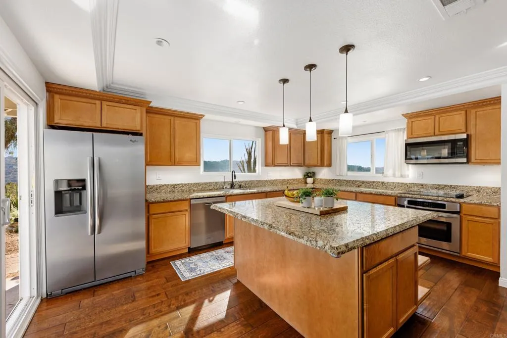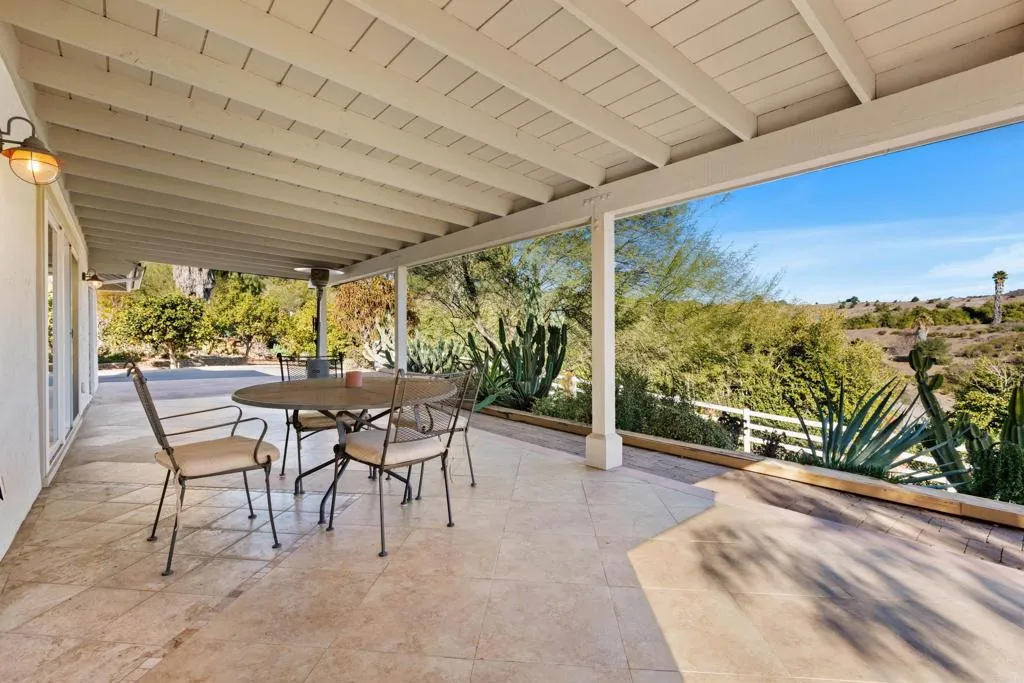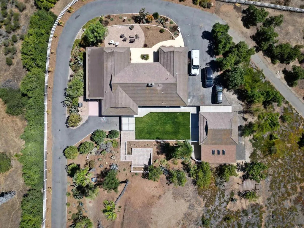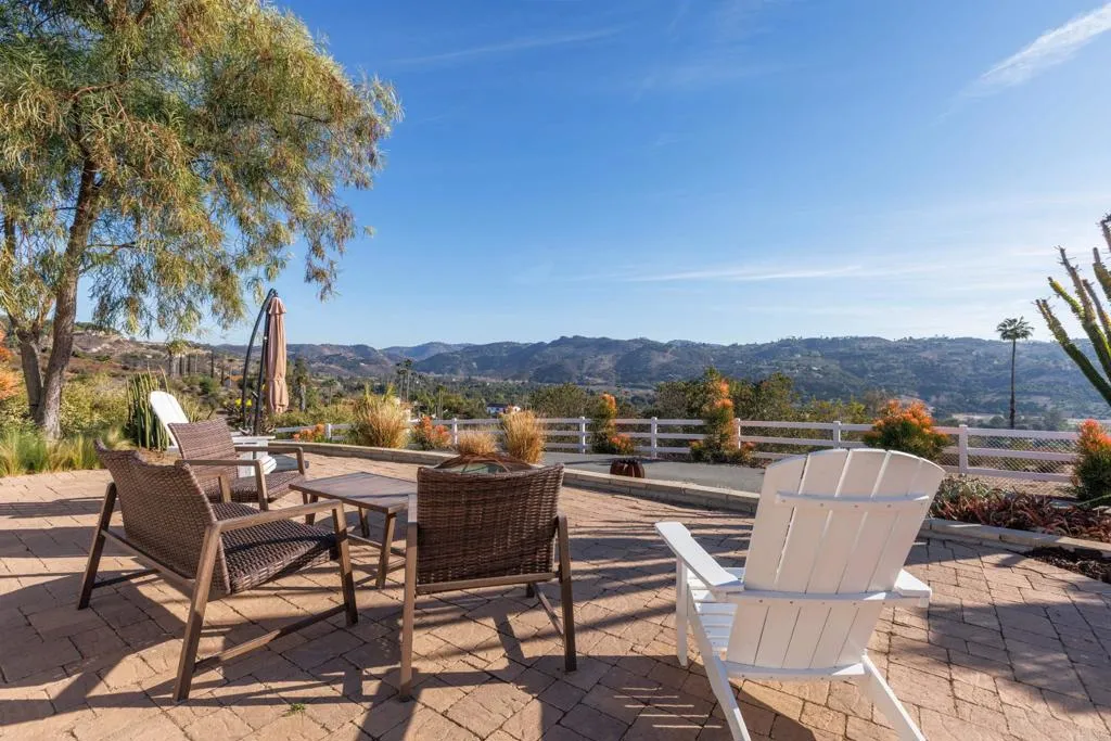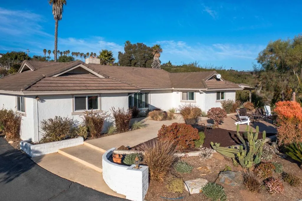 Sweeping panoramic views and peaceful countryside living await at this private, gated, single-story home nestled in the hills of Bonsall. The property offers expansive vistas of Moody Creek Horse Farm and the Hialeah Hills, with views that stretch far beyond, creating an unmatched sense of space, beauty, and tranquility. Set on just under 1.7 fully fenced acres, this hilltop sanctuary captures stunning sunsets and exceptional privacy, with few neighbors in sight. The home features three spacious bedrooms and two and a half bathrooms, including a newly remodeled primary suite bathroom. Inside, hardwood floors flow throughout open, sun-filled living spaces. The living room showcases mountain views, and the dining area opens to a covered patio through sliding glass doors, perfect for seamless indoor-outdoor living. Outdoors, enjoy a wraparound driveway with ample parking, a covered side patio for evening dinners, and a front patio ideal for morning coffee and sunrise views. The backyard features a newly landscaped grassy area and an elevated view patio. There are numerous spaces to relax, entertain, or consider adding a pool or ADU. The property includes just the right number of avocado and citrus trees for personal use, easy to care for yet productive. A truly special Bonsall retreat, this home offers the best of Southern California countryside living, tranquil, scenic, and move-in ready, with endless potential for the future.