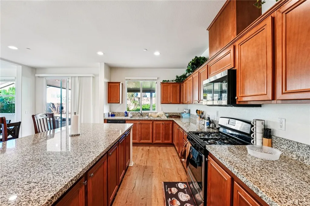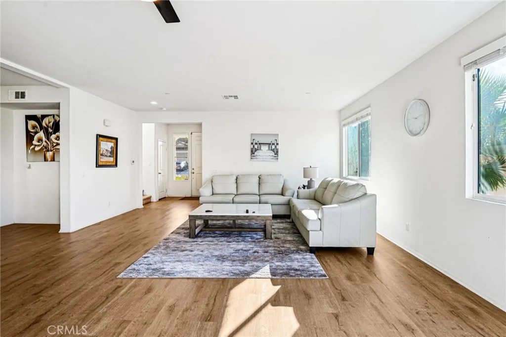 Beautiful 4 bed, 3.5 bath Jurupa Hills home offers great curb appeal with 2,959 sqft of living space and sitting on a 8,276 sqft lot! The interior features an open and spacious floor plan with recessed lights, vinyl flooring in the main living spaces, and an abundance of natural light throughout. The huge living room flows into the dining area and the gorgeous kitchen with large center island, granite countertops, wood cabinetry and a pantry. A main floor bedroom, full size bathroom, and a half bathroom complete the main floor. Upstairs you will find a huge bonus loft or 5th bedroom option as well as the primary suite with private ensuite featuring a soaking tub and a separate shower, as well as a walk-in closet. There is also a 2nd floor, full-size, hall bathroom for the 2 secondary bedrooms to share, and a large laundry room with extra storage space. Relax and entertain in the lush backyard with covered patio, and this home also has an attached 3-Car Garage. Conveniently located not far from shopping, dining, Oak Quarry Golf Club, trails, and the 60 Fwy, schedule your tour today!