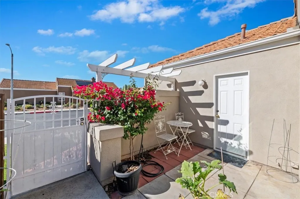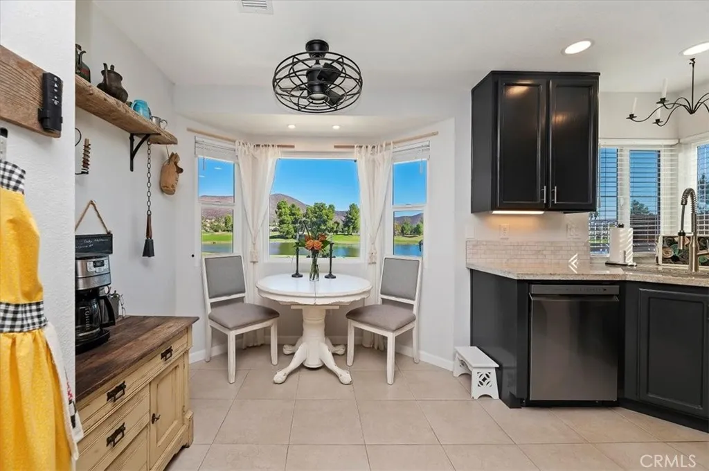 VIEWS OF THE GOLF COURSE, VIEWS OF THE LAKE,VIEWS OF THE MOUNTAINS! This fantastic home was Designer remodeled in 2024. It has NEW windows, interior paint, exterior paint, lighting, toilets, baseboards, rocker switches, blinds, and elevated washer and dryer, upper end LG stainless steel appliances. Also new granite counters , stainless steel large sink and faucet, Back splash in deco tiles, cabinets painted and glazed, new hinges and handles, pullouts and breakfast nook with a killer view. the is a new filtered water system, garbage disposal and ceiling fans, under cabinet lighting. TV/office room (3rd bedroom) has a built-in desk(closet is removed) and tv mount. Large primary suite with dual vanity, large shower and slider to front patio, as well as a walk in closet and ceiling fan. There is tile throughout the house except bedrooms with carpet. Primary living areas have cathedral ceilings. Water heater and AC replaced in the past 3-4 year. The tile roof was redone with new 2 ply paper in 2024. The 2 car garage has built in shelves, and attic storage. Astro turf front yard, paver walks and accents. The property has easy to maintain landscaping and plants. All of this PLUS it is located the Palmilla 55+ community, with a community pool/spa, as well as you have access to plus the nearby Beach & Swim Club (for a fee) featuring a sandy, resort-style pool with private cabanas, BBQs, and even a waterslide. Menifee Lakes is filled with free concerts in the park, breathtaking sunsets over the water and annual celebrations and parades. Golfers will love the Menifee Lakes Golf Cours