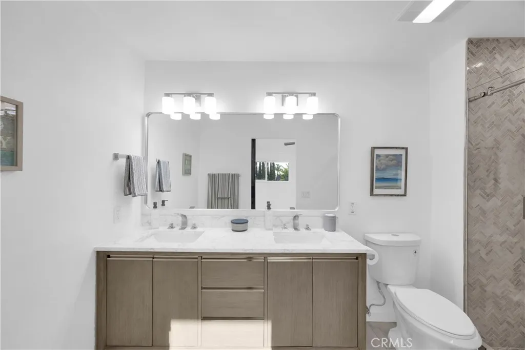 Best in class, stunning, dramatic, drop dead gorgeous...call it whatever you want to...this beauty guarantees not to disappoint! This large 1,888 square foot patio home - the Manchester Model with jaw dropping ceiling heights - has just completed a bold, striking looking remodel. 4 bedrooms (main floor bedroom currently used as office) 3 remodeled bathrooms with designer touches like you are in a 4 star hotel, huge living room with vaulted ceiling, concrete fireplace with driftwood mantel, new modern wrought iron staircase, impressive lighting with access to rear patio. Large remodeled kitchen, with abundant cabinetry, quartz countertops, new stainless steel appliances(slide in range with wifi/air fry) open to spacious dining room with access to back patio. New dual pane windows/patio doors, new AC/FAU/ducting, new waterproof hybrid flooring throughout, new lighting etc. Direct access 2 car garage. With its very desirable location within the community, and backing up to a quiet gentle greenbelt too, makes this a reimagined stunner for the ages. (This objectively accurate description is "I" talking, not A.I. - True). Just check out the pics and come see it for yourself, you can't help but agree. Westminster Village is an amazing beautiful community with streams, water features, walking paths, playground, and greenbelts, and amenities - pools, spa, tennis, clubhouse, etc - and crazy LOW HOA FEES ($375/M) that even includes earthquake, fire, and walls-in insurance, roof, exterior paint, and more.