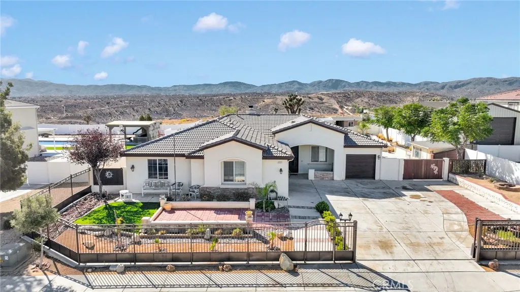 Make a splash with this modern 4-bedroom beauty! This home is all about comfort, style, and space to enjoy. Step inside to a welcoming formal living and dining area, a cozy family room with fireplace, and a kitchen designed for both chefs and snackers alike complete with an island, solid-surface counters, Cherry Maple cabinets, pantry, and shiny new appliances. Out back, its your own private retreat: a sparkling in-ground pool, shaded pergola perfect for lounging or weekend BBQs, and extra outbuildings for all your storage needs or hobby projects. The impressive gated entrance sets the tone the moment you arrive, and the fenced lot with views gives you room to breathe. Add in a long-lasting tile roof, convenient indoor laundry, and a spacious 3-car garage this one checks all the boxes. Come see it today and start picturing your summer pool parties already!