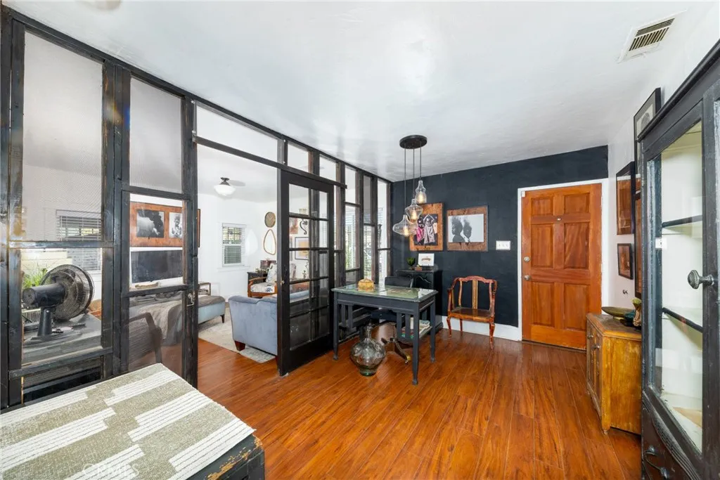 Charming 1923 Vintage Home with Character and Modern Comforts. This beautifully maintained 2-bedrooms, 1-bath vintage home, offers a perfect blend of period details and thoughtful updates. The inviting curb appeal features year-round landscaping with mature plants and flowers, a warm welcome upon arrival. Inside pendant lighting highlights the office/desk set-up upon entry, before entering into a bright living room, bathed with sunlight from the large double-pane picture window and French doors that open to a quaint outdoor patio. A custom glass-framed wall with sliding door, uniquely separates the office area from the living room and sitting TV area, creating a versatile living space. The Kitchen offers upper open shelving, lower cabinetry, a vented hood over stove that blends vintage charm with functionality. Bath includes a vintage vanity, and faucet, including a tub-shower combo. Both bedrooms include new ceiling fans; the front bedroom features a custom barn-door closet, while the spacious second bedroom boasts a walk-in closet. Laundry is located on the service porch with access off the kitchen or directly from the backyard. The fully fenced 7,750 sq. ft. lot is dotted with fruit trees-including almond, pomegranate, and plum and includes a detached one-car garage with a tandem, and upper cabinets for lots of storage. This delightful home combines the character of 1920s architecture with thoughtful modern updates a rare find for vintage-home enthusiasts. Conveniently located near freeways, shopping, parks.