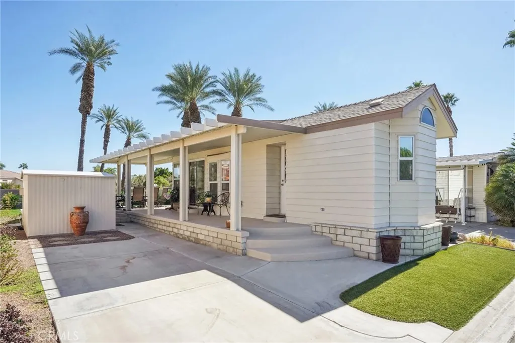 Welcome to this wonderfully appointed and perfectly situation vacation "Tiny House." This unit is in an active adult community that thrives for part-time residents and 'snow-birds'. Situated on the boulevard with no neighbors behind allows for fabulous views and tons of personal space. The deck is enormous with multiple seating areas and BBQ area. There's also a wonderful grassy area behind. Inside you'll find vaulted ceilings, well-appointed kitchen, including dishwasher and garbage disposal, as well as tons of storage. The full size queen bed is walk around with ample closet space and even underbed storage. This place has been lovingly care for by it's owners for nearly two decades. There's a shed for additional storage. The community has three pools in all, pickleball courts, shuffleboard, a huge putting green as well as golf driving practice area and pitch and putt field to play. The available activities are expansive both in and out of the community including concerts, dinners, games, golf and other sports competitions as well as field trips to sporting events and museums. You own the land here, no land lease. So, come take a look at this lovely little place and see that you also get a whole new lifestyle with it. This community does not allow pets and is for adults who are at least 55. Come see all that the desert has to offer in this "tiny" but lovely package.