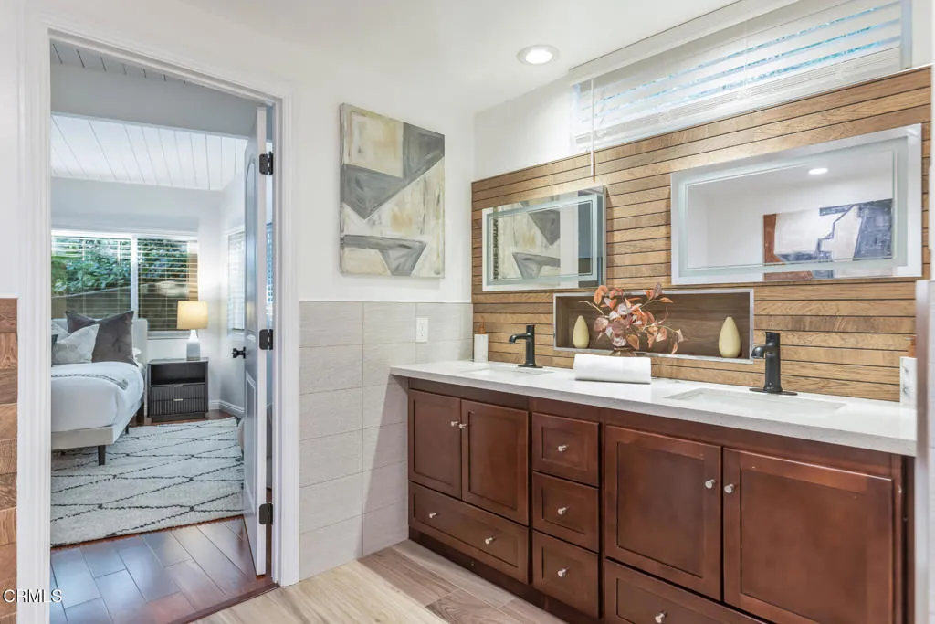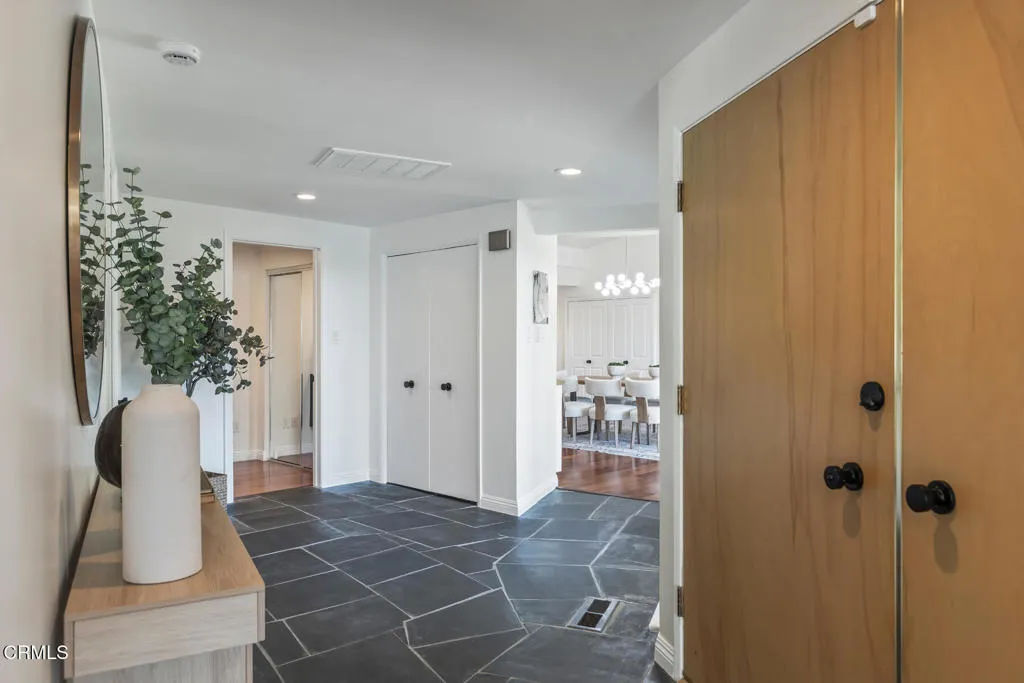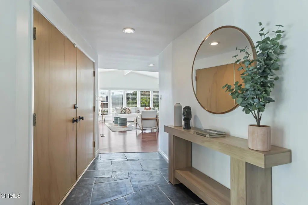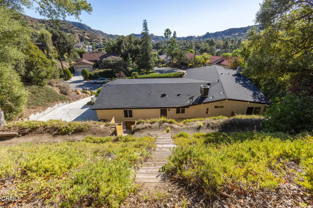 Perched atop a gentle hill in the sought-after San Rafael Estates, this exceptional mid-century modern home blends timeless design with modern comfort to elevate everyday living. A flat, private front yard framed by lush greenery creates a serene escape from city life and a welcoming first impression. Classic double doors open to a formal entry that sets the tone for the home's warm and inviting style. The spacious living room is bathed in natural light, anchored by a floor-to-ceiling stone fireplace, soaring beamed ceilings, and an expansive wall of windows that bring the outdoors in, the quintessential mid-century touch. At the heart of the home, the open-concept kitchen and dining area are designed for both daily living and effortless entertaining. The sleek white kitchen features an island cooktop, allowing the chef to stay connected while preparing meals, with views of the front yard. A designer chandelier, built-in shelving, and direct patio access make the dining area an ideal gathering space. The primary BR suite is a peaceful retreat, offering a private entry, a wall of closets, and a beautifully updated bath with dual vanities, illuminated mirrors, and a separate tub and shower. Two additional spacious, bright and airy bedrooms share a hallway bath. The back has a patio area and hillside stairs that lead to an upper terrace with sweeping views of the city and beyond offering a blank canvas for your outdoor vision, whether it's a garden, seating area, or entertaining space. Additional features include: an oversized two-car garage with direct interior access and new