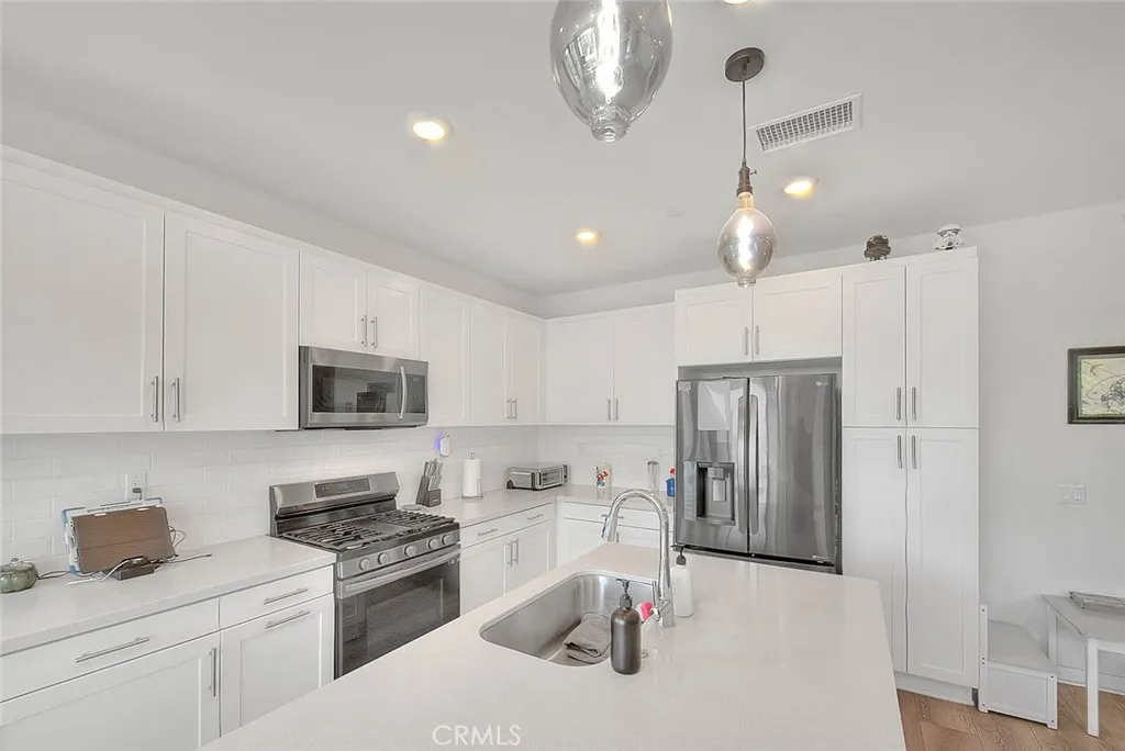Modern floor-plan with modern design and lifestyle. This open concept 2 bedroom, 2 bathroom, Laundry Closet, 2-car garage Condo, was built in 2022 in the up and coming city of Ontario, and Ontario Ranch neighborhood. Wood laminate flooring, custom window coverings, stainless steel appliances, quartz countertops, washer & dryer included. Energy efficiency: leased solar panels and tankless water heater. Community features: pool, spa, clubhouse, playground and gated dog park. Close in proximity to new Ontario Dodger TowerBuzzer Stadium, Ontario Airport, 10, 15 & 60 freeways and more!