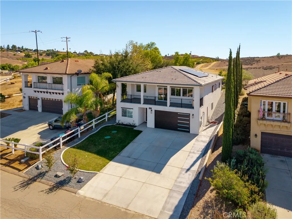 Nestled in the desirable Woodcrest neighborhood, this stunning two-story residence offers spectacular hillside and city views, providing a breathtaking backdrop to everyday life. NO HOA, NO MELLO ROOS, and Low Taxes With just under 3,000 square feet of living space, this beautifully designed home features 4 spacious bedrooms, 3 full bathrooms, and a dedicated office area. The first floor showcases elegant plank tile flooring, while the second floor features durable luxury vinyl plank flooring. All bathrooms are finished with timeless porcelain tile. The gourmet kitchen is a culinary dream, featuring premium quartz countertops and a seamless flow into the open-concept family roomperfect for entertaining or relaxed everyday living. Step outside to enjoy the covered patio and professionally landscaped front and back yards, designed for both beauty and low maintenance. The private upstairs balcony offers sweeping views, ideal for enjoying your morning coffee or unwinding at sunset. This energy-efficient home includes fully paid-off solar panels, dual A/C units for zoned climate control, and a 50-amp EV chargerready for your electric vehicle. Fire sprinklers throughout add an extra layer of safety and may help reduce insurance costs. Additional highlights include an oversized laundry room with generous pantry space and an attached two-car garage. Dont miss your opportunity to own this thoughtfully upgraded, move-in-ready home that blends custom craftsmanship with modern comfort.