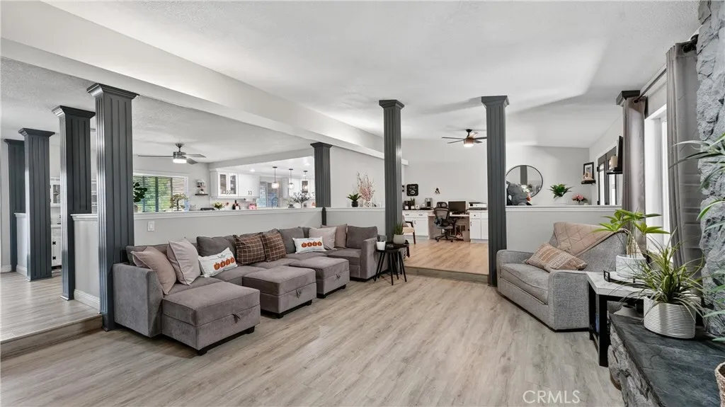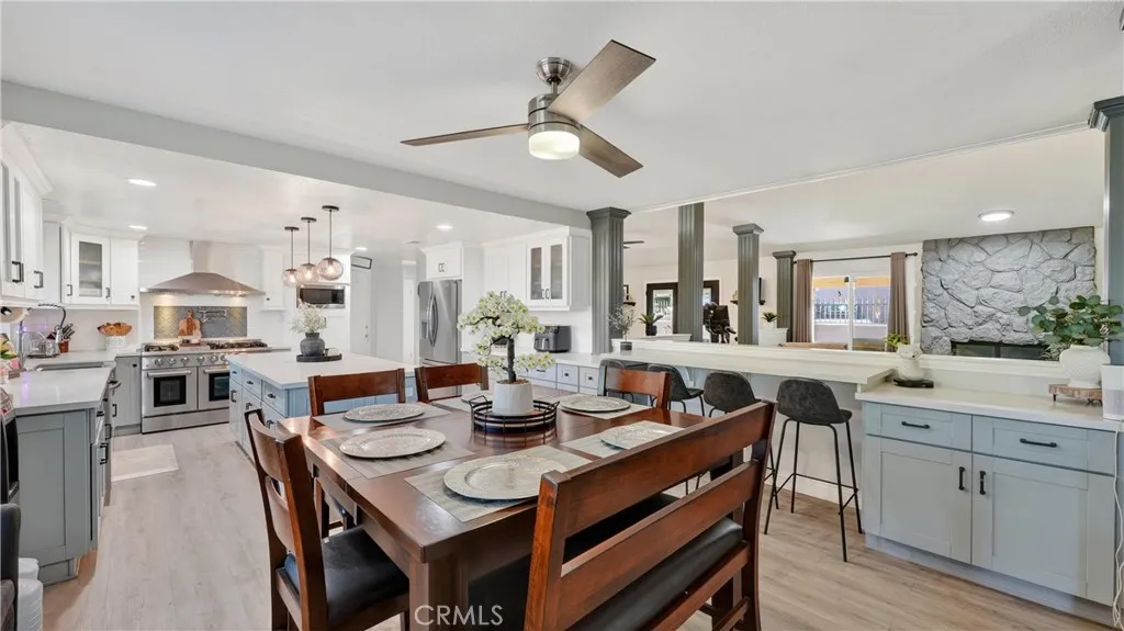 Discover 2,487 sq ft of fully remodeled bliss on a massive lot, framed by the San Bernardino Mountains. This single-story gem delivers open-concept living, boundless storage, and an epic entertainer's backyard perfect for families and fun. Golden natural light pours through energy-efficient windows into a soft neutral palette, where luxury vinyl plank flooring flows throughout and central AC/heating ensures year-round comfort. The chef's kitchen shines with sparkling quartz counters, a large center island, 48" double oven, with a swing arm pot filler faucet, stainless steel appliances, farmhouse sink, and crisp white shaker cabinets under chic globe pendants. It flows seamlessly to the dining area with built-in hutch and family room anchored by a dramatic stone fireplace. Four spacious bedrooms feature ceiling fans and ample closets, paired with 2.5 spa-inspired bathrooms offering dual vanities, frameless glass showers, subway tile, with modern fixtures. A private indoor laundry adds everyday ease. Storage is unmatched with a 565 sq ft attached garage (220 sub for welding) plus a massive 3-car detached garage with a custom built (12x25 alumawood carport) perfect for RVs, boats, workshops, or home gym. The backyard oasis captivates under a covered patio with string lights, built-in outdoor kitchen (gas grill, sink, bar seating), regulation pool table, bubbling spa, fire pit seating, 4 large storage sheds, artificial turf lawn, mature citrus fruit trees, dog run, paver paths, secure fencing, and stunning mountain views. Curb appeal dazzles with a durable tile roof, swaying