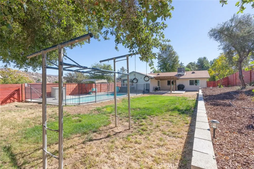 Welcome to your own private retreatthis charming ranch-style pool home sits on a spacious lot with sweeping views of the San Jacinto Valley and surrounding mountains. Freshly updated inside and out, the property features new dual-pane windows, new carpet, fresh interior and exterior paint, and a new electric front gate for added convenience and security. Step inside through a covered arched patio and into a warm, inviting living area complete with a wood-burning fireplace, perfect for cozy evenings. The kitchen opens seamlessly to a spacious family room where you can entertain guests or relax while overlooking the sparkling in-ground pool and scenic backyard. The kitchen comes equipped with stainless steel appliances, under-cabinet lighting, and ample counter space. The primary suite features French doors, a walk-in closet, and a private bath. Two additional bedrooms offer comfort and natural light. Outside, youll find an expansive backyard with mature shade and fruit trees, plenty of room for gatherings, gardening, or even a future small horse setup or additional structure. The newly added backyard patio enhances outdoor living, while the two-car garage delivers abundant storage and workspace. A detached front office provides versatile options for work, hobbies. Nestled at the end of a peaceful cul-de-sac, this home offers a sense of country living while still being just minutes from Diamond Valley Lake, Valley-Wide Park, and local amenities. Move-in ready and full of charmdont miss your chance to own this beautiful, upgraded ranch home! Home has been virtually staged to s