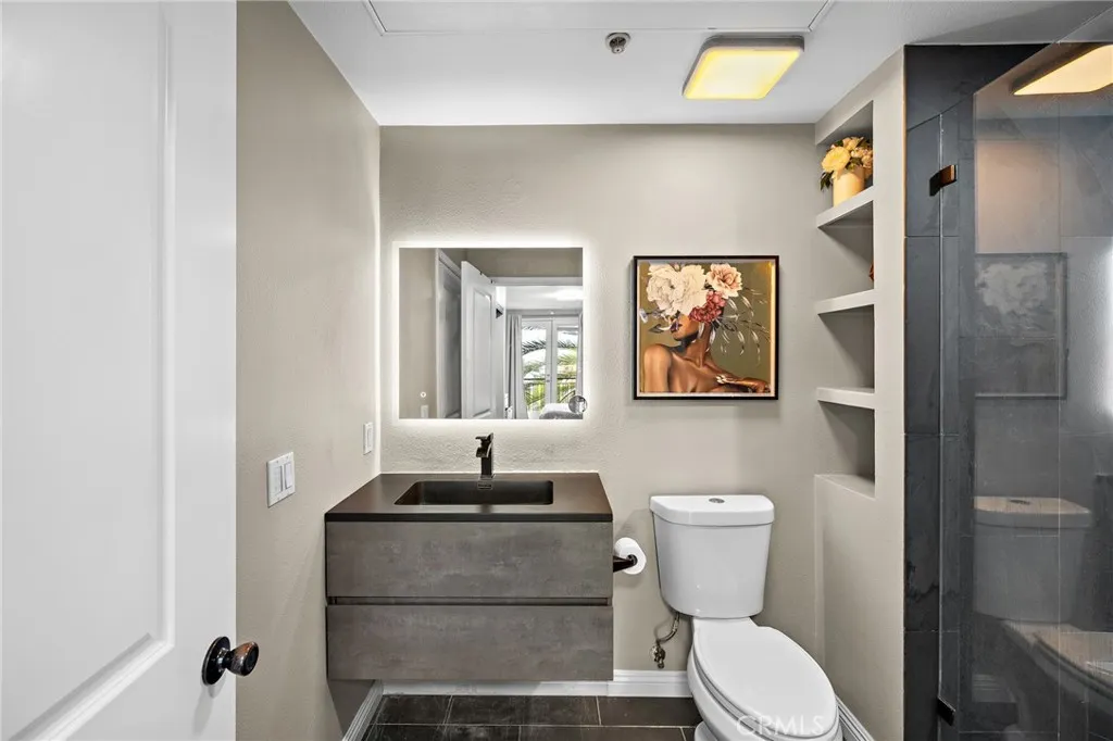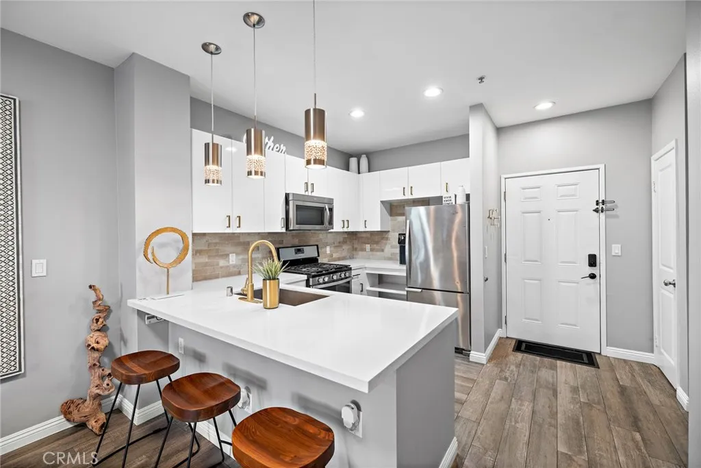 Welcome to this stunning top-floor fully furnished condo at 1801 E Katella #4005 in Anaheim, California, where elegance meets convenience. Nestled in the highly desired Platinum Triangle neighborhood, this meticulously remodeled home has wonderful city views and boasts prime access to parking, an elevator, and storage, making it a true gem in the community. This unit comes with two parking spaces and a storage room. Step inside this delightful 784 square foot home, adorned with exquisite porcelain flooring that flows seamlessly throughout. The living space is bathed in nourishing natural light from large glass French doors that invite you to unwind on your private balcony. Enjoy evenings in your cozy living area, equipped with a large flat-screen TV, offers a perfect spot for relaxation. The modern kitchen features sleek white high-gloss cabinets with stylish brass hardware, a state-of-the-art pull-down brass faucet, and quartz countertops with elegant bar seating illuminated by beautiful LED pendant lights. With newer stainless-steel appliances and a new garbage disposal, every meal can be crafted with ease. Retreat to the spacious primary bedroom, designed for comfort with ample space for a king-sized bed. Revel in the grandeur of a lovely hanging light fixture and a generous walk-in closet that caters to all your storage needs. The updated bathroom features an updated sink with a touch-sensitive lighting mirror, Alexa speaker, a glass walk-in shower adorned with a stone mosaic floor, and Italian slate tiles. This home is complete with an efficiently designed laundry clos