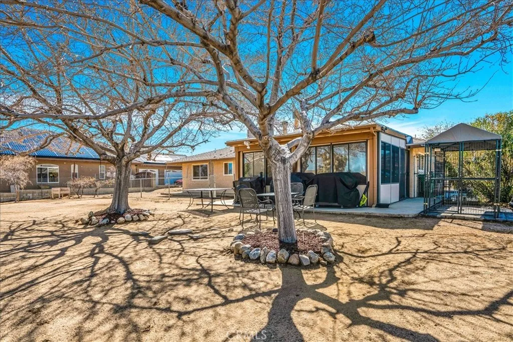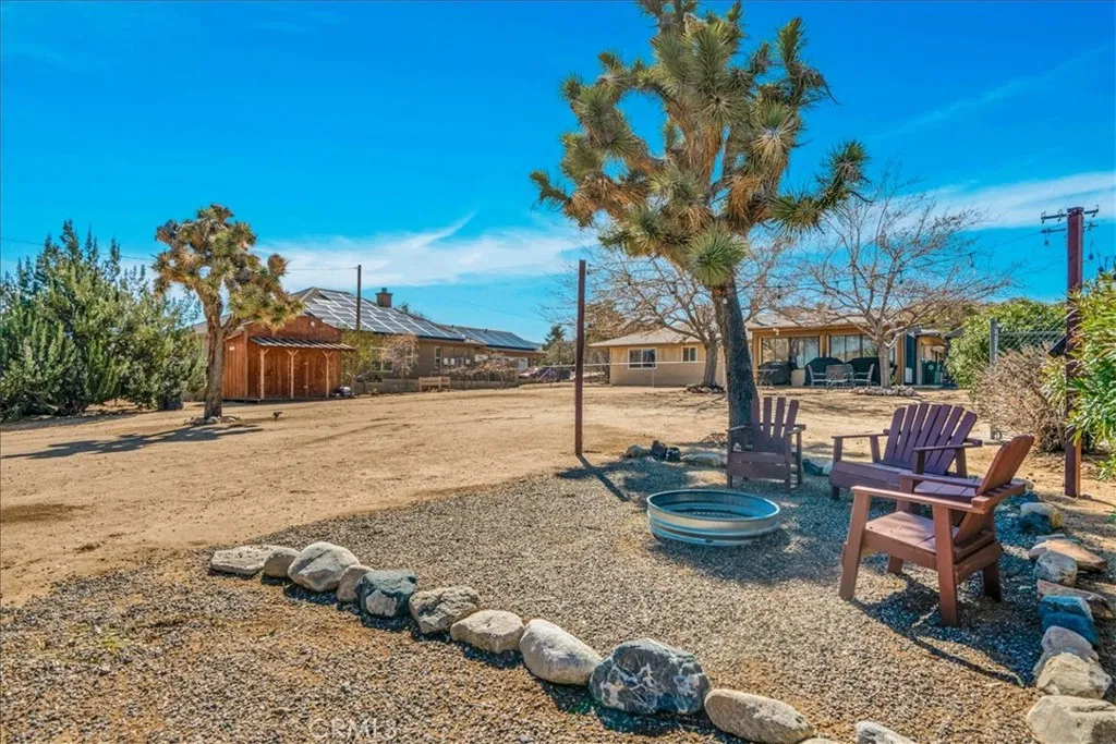 This well maintained 2-bedroom, 2-bathroom ~Potential for a 3rd Bedroom~ home is situated on a desirable corner lot in the sought-after Sky Harbor neighborhood, it spans approximately half an acre and is surrounded by mature trees and a beautiful desert landscape with scenic views. BRAND NEW heating and A/C units! The living room has built-in shelving and a cozy natural gas fireplace. The kitchen is equipped with stainless steel appliances, including a gas stove and built-in microwave, and the dining area is conveniently located off the kitchen. A separate office space with built-in cabinets offers direct access to the enclosed patio and garage. The spacious primary bedroom comes with an en-suite bathroom, while the large secondary bedroom is adjacent to a hall bathroom. As an added bonus there is an enclosed patio that adds an additional 280sq ft of living space and features a natural gas heater, carpet flooring, and lovely views of the yard. The attached 2-car garage includes evaporative heating and cooling, laundry area with a sink, built-in cabinets, a newer water heater, and carpeting. This space can be used as a traditional garage or additional space for an in-home gym, possible 3rd bedroom option or extra storage, providing versatility. The backyard, which has gated access from Warren Vista, features a separate 2-car garage, fire pit area, cowboy shed, garden areas, and ample space for RV or boat storage. Fully fenced for privacy, this home also boasts a newer roof, making it a fantastic opportunity for any buyer. Close Proximity to Joshua Tree National Park, Pioneer