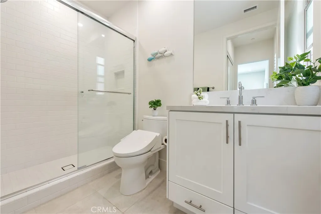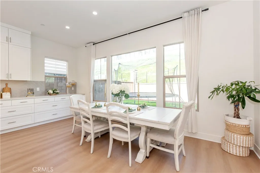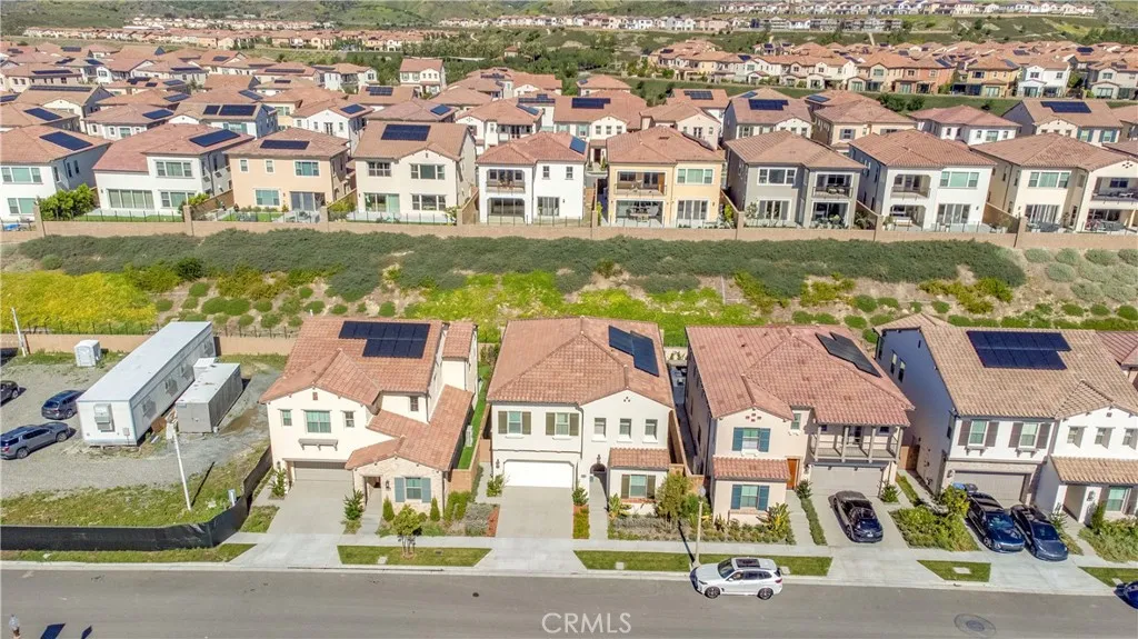 Situated in the highly sought-after Portola Springs village, this elegant contemporary residence offers 4 bedrooms and 4.5 bathrooms, blending thoughtful architectural design, light-filled interiors, and refined finishes in one of Irvines premier master-planned communities. A main-level bedroom is privately positioned off the foyer, ideal for guests, multigenerational living, or a dedicated home office. The entry opens to a dramatic living room with a grand two-story ceiling, creating an impressive sense of scale and openness. Floor-to-ceiling sliding glass doors extend the space to a beautifully landscaped backyard with low-maintenance turf and generous usable areaperfect for outdoor dining, recreation, or future customizationseamlessly embracing the indooroutdoor lifestyle. Designed with a true open-concept layout, the living, dining, and kitchen areas flow together to create an inviting and highly functional gathering space. The kitchen opens to the dining area, where oversized windows frame views of the backyard and bring in abundant daylight. Highlights include an oversized center island, full backsplash, high-end appliances, a walk-in pantry, and floor-to-ceiling white cabinetry offering exceptional storage. The first floor features newly installed luxury vinyl flooring, combining modern style with durability. The home also includes fully paid-off solar panels, supporting energy efficiency and long-term savings. Upstairs offers a dedicated laundry room and three en-suite bedrooms, providing privacy and comfort for every household member. Two secondary bedrooms face so