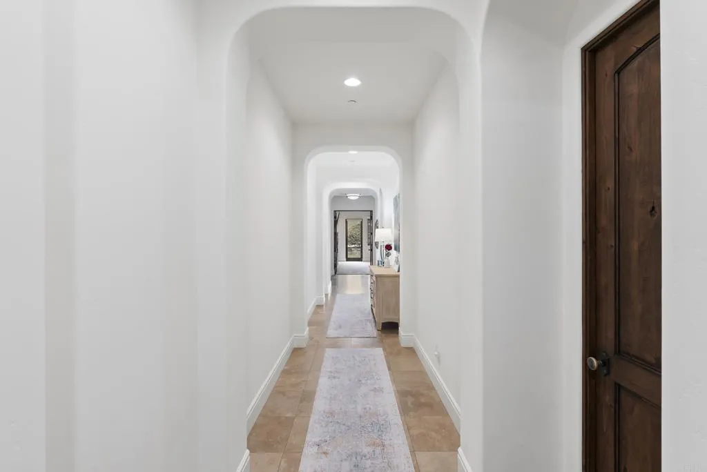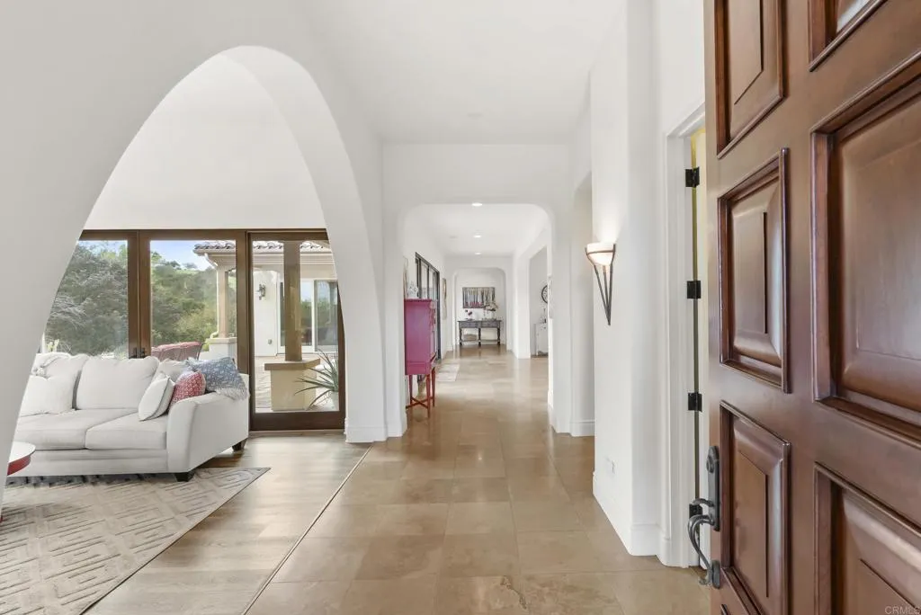 Tucked inside the gated enclave of Malabar Ranch, this SINGLE-LEVEL estate, built in 2011 by Beucler Signature Homes, offers space, privacy, and refined comfort without sacrificing convenience. Less than five minutes to the 76 freeway and 10 minutes to the 15 freeway, yet once inside the gates, it truly feels like a world away. Set on approximately two acres overlooking a preserve, this 4,800 sq ft home is designed to let you breathe. Generously sized living spaces, three bedrooms each with ensuite baths, and a spacious den/office/or fourth bedroom provide flexibility for everyday living or hosting guests. Stunning solid wood doors and windows frame the surrounding views and invite the outdoors in, highlighting the craftsmanship and quality materials throughout. At the heart of the home, the kitchen balances warmth and performance with high-quality cabinetry, a large island, subway tile backsplash, custom tile over the cooktop, dual walk-in pantries, and a butlers pantry/wet bar. Thermador appliances include a built-in refrigerator, 6-burner range with griddle, double ovens, microwave, warming drawer, and dual dishwashers. Remote control gas fireplaces add instant charm in the family room, living room, dining room, and primary suite. The primary retreat also features a wet bar, soaking tub, and dual-head shower. Outside, life slows down. Enjoy open views from the saltwater pool and spa, gather around the outdoor kitchen and covered dining area with TV, unwind by the courtyard fireplace, or practice on the putting green. Whole-house water filtration, instant hot-water circul
