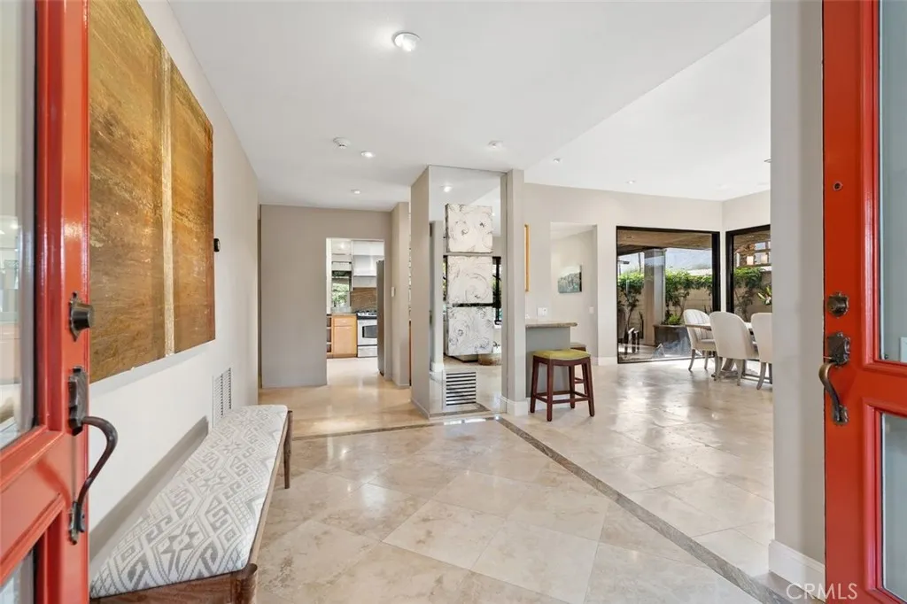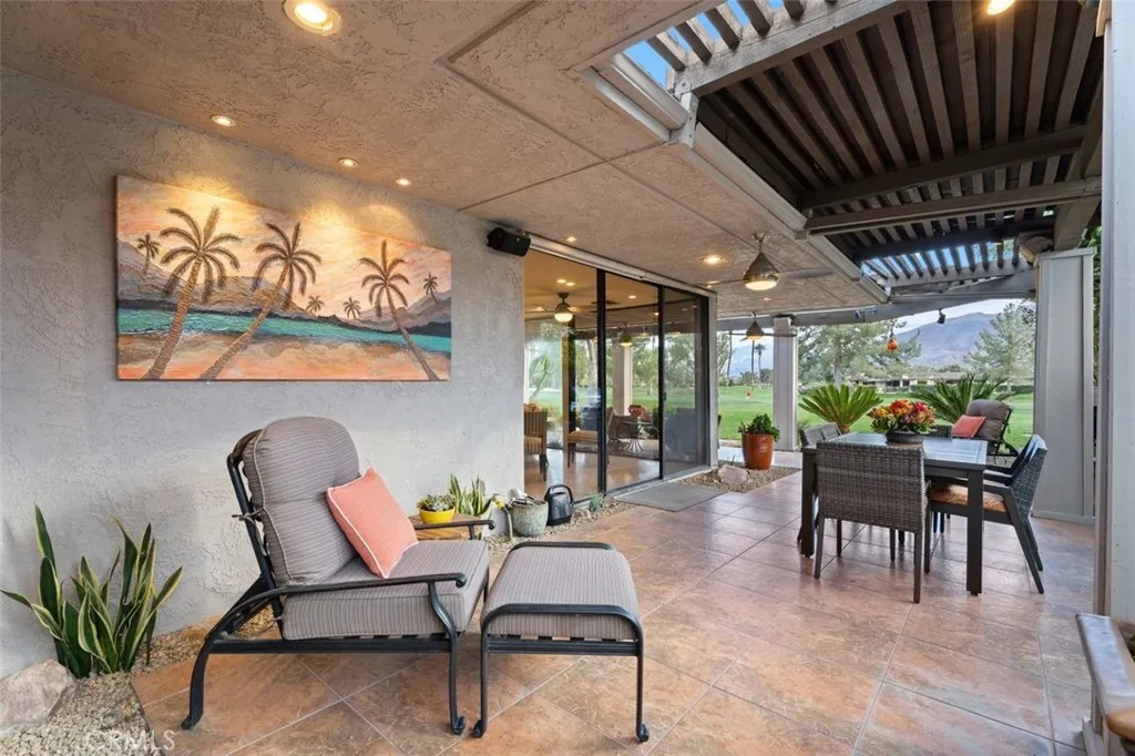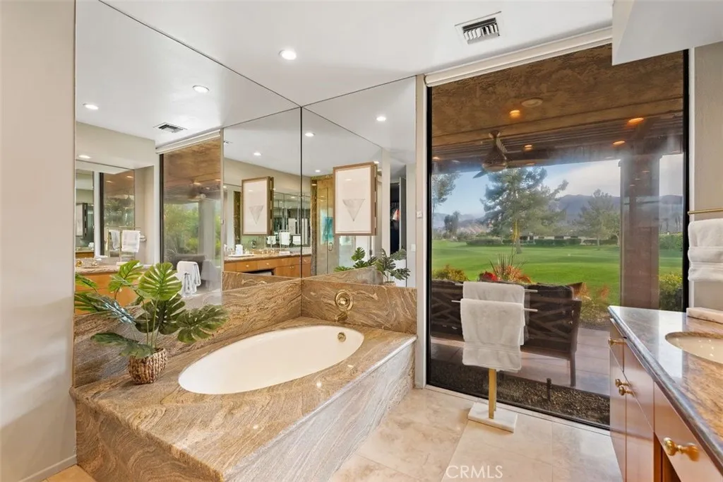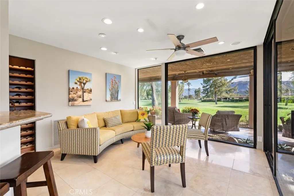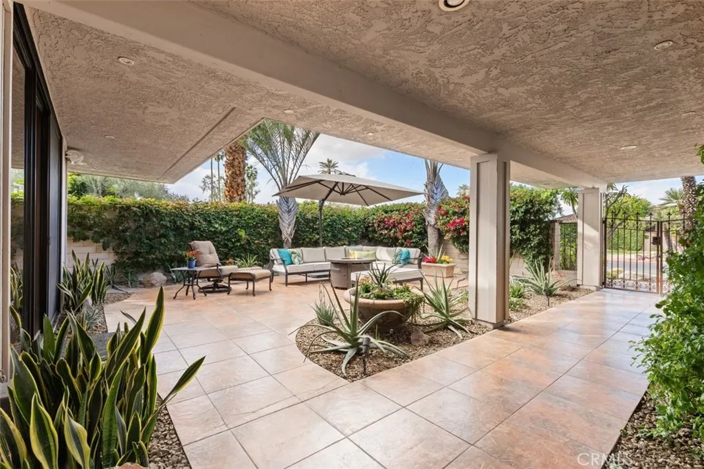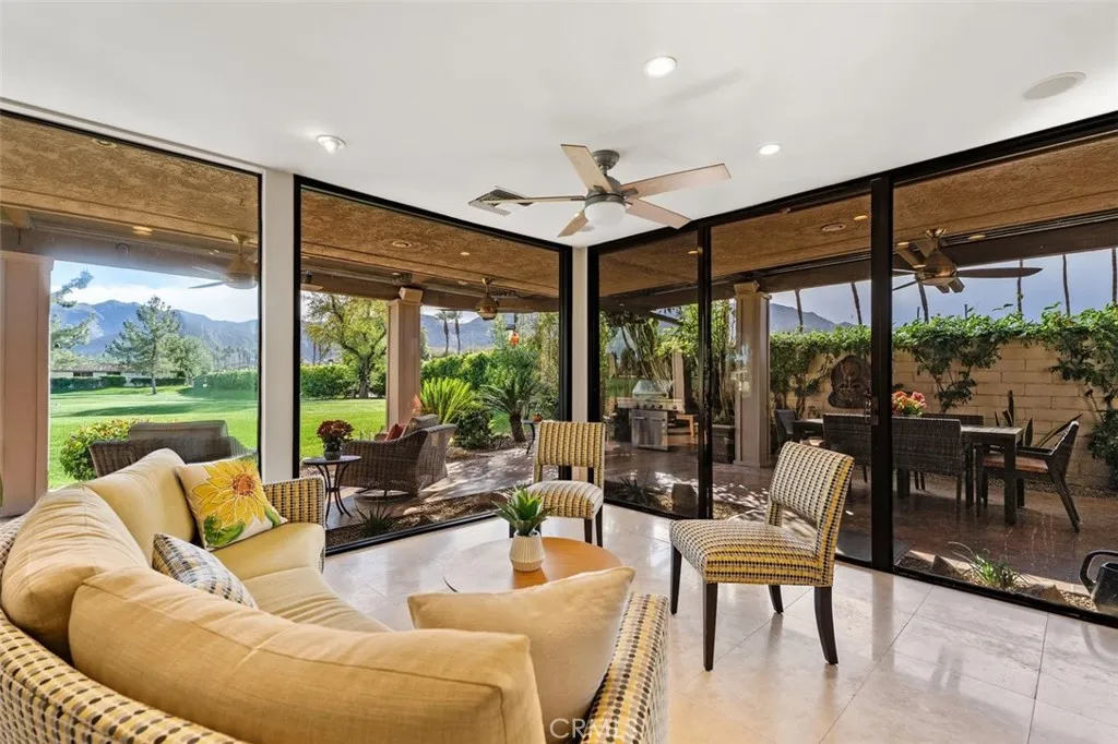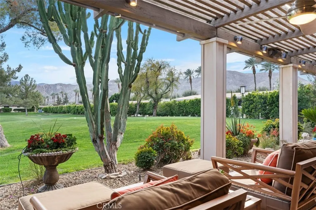 Welcome to your desert dream home in the heart of The Springs Country Club where luxury, lifestyle, and location come together seamlessly. Perfectly positioned on the prestigious 3rd hole of the championship golf course, this beautifully maintained 3-bedroom, 3-bath residence offers nearly 2,700 square feet of thoughtfully designed living space. With its coveted south-facing orientation, the home captures breathtaking mountain views and abundant natural light throughout the day. A large, tranquil private front courtyard welcomes you with a serene Koi pond, creating an inviting outdoor retreat ideal for morning coffee or evening gatherings. Inside, neutral stone flooring flows through the main living areas, complemented by new contemporary low-pile carpeting in the bedrooms for a fresh, modern feel. Designed for effortless indoor-outdoor living, the spacious layout opens toward the golf course and mountain backdrop. The primary suite is a true sanctuary, featuring two generous walk-in closets and a well-appointed en-suite bath. The kitchen combines style and functionality with slab granite countertops, a gas range, and stainless steel appliances perfect for both everyday living and entertaining. Additional highlights include a two-car garage plus a dedicated golf cart garage, both finished with durable epoxy flooring. Ideally located directly across from Eisenhower Medical Center and just minutes from shopping, dining, and entertainment at The River at Rancho Mirage and El Paseo, this home offers both privacy and convenience. Residents of The Springs Country Club enjoy a v