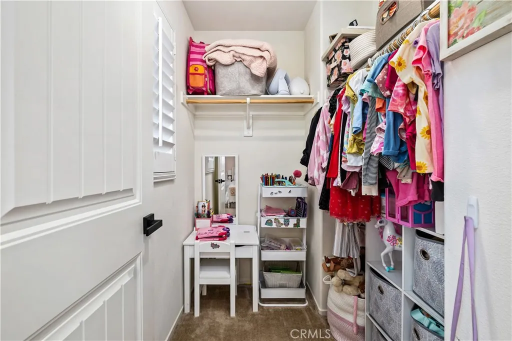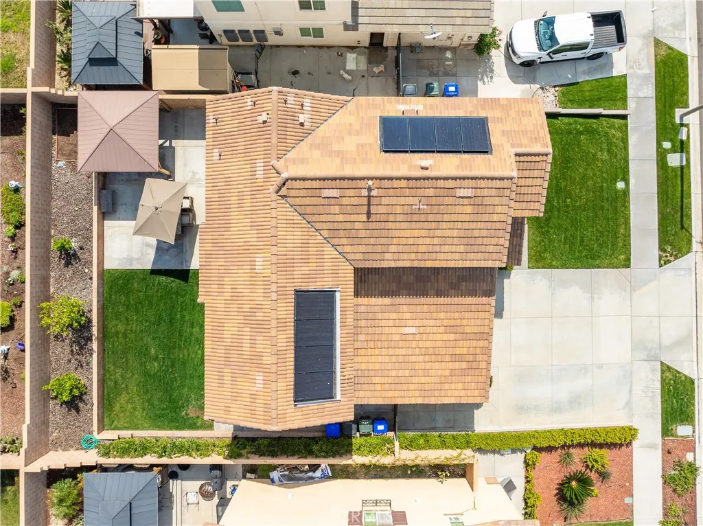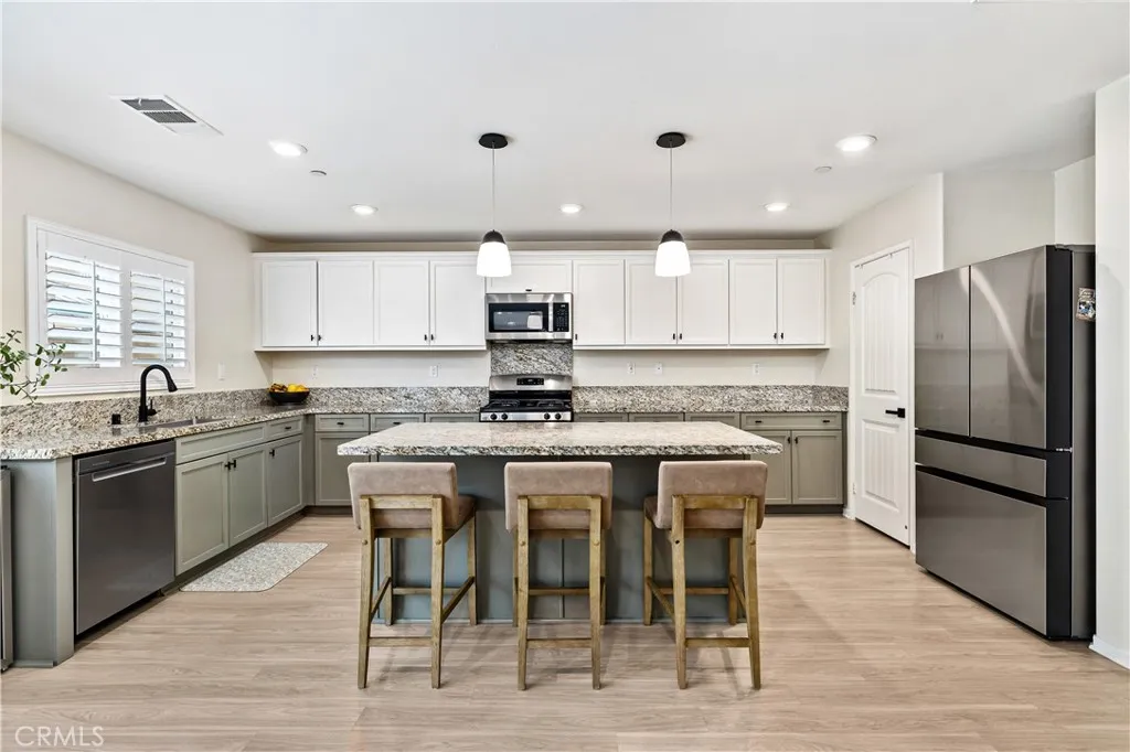 Beautifully upgraded North Fontana residence in the desirable Sierra Lakes area in the Etiwanda school district featuring a versatile floor plan, refined interior finishes, and a fully designed backyard built for outdoor enjoyment. Mediterranean-inspired architecture creates strong curb appeal with manicured landscaping, decorative shutters, a tile roof, and a covered arched entry leading to a wide driveway and two-car garage. Inside, the home opens to a bright entry featuring recessed lighting, wood-look flooring, and decorative wall molding. The layout expands into a spacious open-concept great room with recessed lighting and large windows with plantation shutters allowing abundant natural light. The kitchen is designed with both style and function in mind, offering a large center island with bar seating, granite countertops, shaker-style cabinetry with modern hardware, stainless steel appliances including gas range, microwave, dishwasher, and refrigerator, and a walk-in pantry. The kitchen flows seamlessly into the dining and living areas with sliding glass doors providing direct backyard access. A main-level bedroom provides flexibility for guests, office, or multi-generational living and is adjacent to a full bathroom with matte black fixtures, decorative wall paneling, and a glass-enclosed tiled shower. A dedicated laundry room offers countertop workspace and open shelving for storage. Upstairs, a spacious loft with wood-style flooring, ceiling fan, recessed lighting, and plantation shutters provides additional living space. The primary suite features wood-style floor