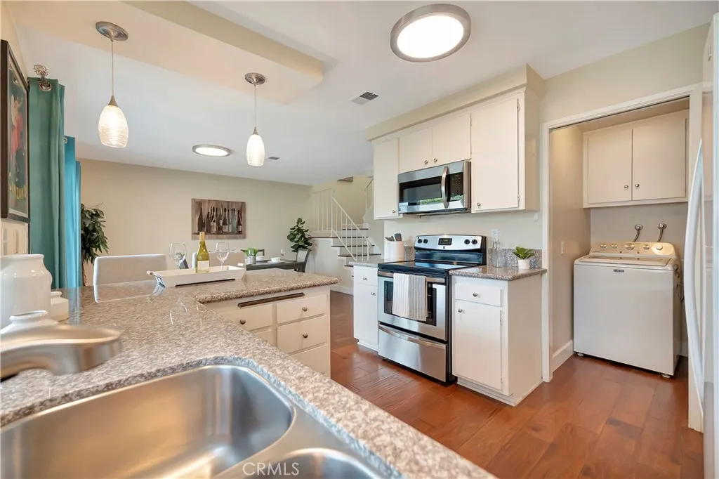 Welcome to this beautifully updated two-story residence located in the highly sought after Westminster Village community an enchanting home that truly captures the charm of an Artists Cottage. Every detail has been thoughtfully curated, from the inviting front patio to the peaceful backyard retreat, creating a warm and welcoming atmosphere throughout. Inside, youll find a bright, open-concept floor plan designed for both comfort and entertaining. The spacious living room features a romantic fireplace, scraped ceilings, and elegant faux wood laminate and tile flooring that flows seamlessly throughout the main level, which also includes a convenient half bath. The kitchen is a chefs delight, highlighted by a large picture window over the sink that looks out onto the tranquil patio, along with sliding doors that open to a private outdoor sitting area perfect for morning coffee or evening relaxation. Upstairs, the home offers two well-appointed bedrooms and a beautifully remodeled full bathroom featuring a Solar Tube for natural light. The oversized primary suite is a true retreat, complete with a walk-in closet and wall-to-wall mirrored wardrobes. Dual-pane windows throughout enhance energy efficiency, comfort, and privacy. Additional features include central heating and air conditioning, Solar tube in the stairway and spacious two-car garage with built-in cabinetry, and refreshing coastal breezes that flow naturally through the home. HOA dues provide exceptional value, covering fire and earthquake insurance, roof and exterior maintenance, landscaping, and more. Residents of W