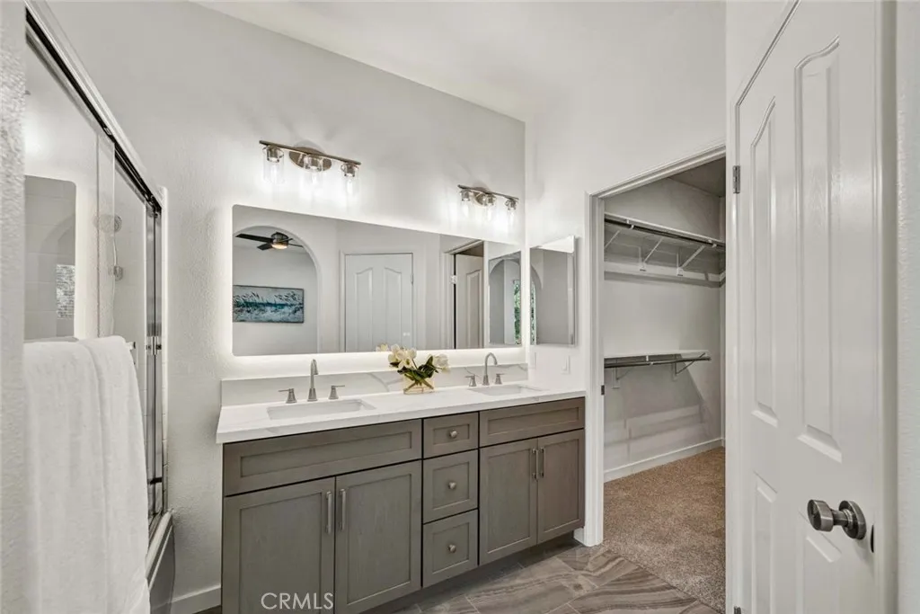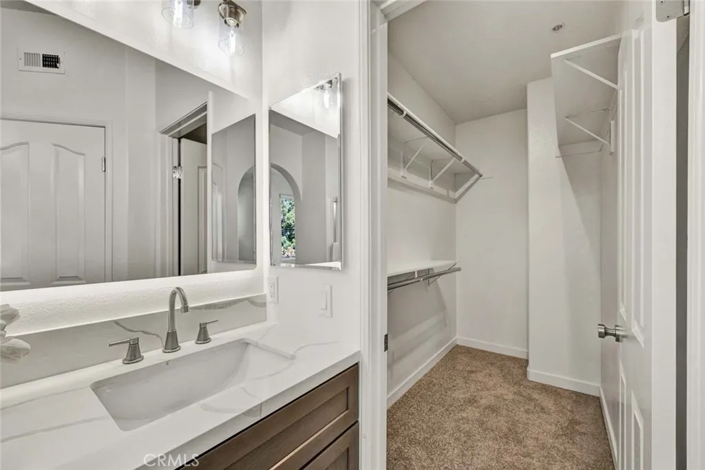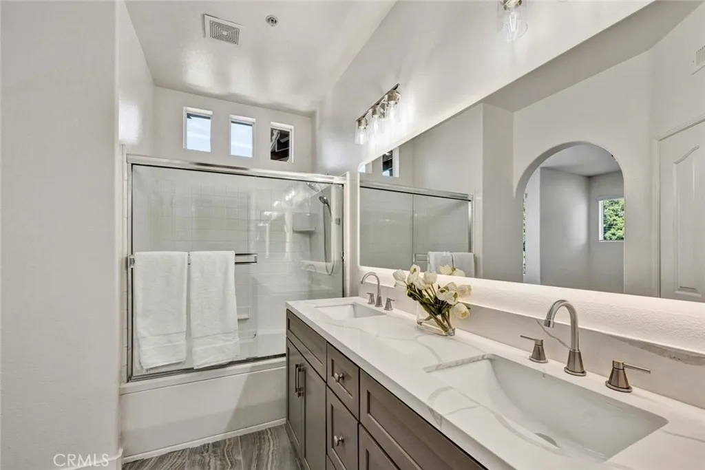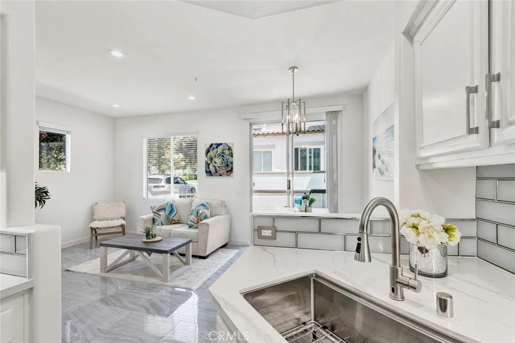 Beautiful turnkey end-unit condominium in a prime, sought-after Tustin Ranch location. Step inside to a fully renovated interior featuring elegant designer flooring, plush new carpet, fresh interior paint, recessed lighting, and stylish designer fixtures throughout, creating a clean and contemporary aesthetic. This two-bedroom, 2.5-bath, two-story home offers true turnkey living. The kitchen is both stylish and functional, showcasing sleek quartz countertops, glass-tile backsplash, under-cabinet lighting, a new dishwasher, and beautifully resurfaced cabinetry with new hardware. A new sink and designer faucet complete the space. All bathrooms have been fully renovated with sophisticated vanities, updated countertops, modern faucets, new toilets, and illuminated touch-control mirrors. The primary suite serves as a private retreat with dual sinks, a sunken soaking tub, and a walk-in closet enhanced with custom shelving and lighting. The attached garage features additional lighting, freshly painted cabinetry, and a built-in workbench for added storage and functionality. Residents enjoy resort-style amenities including a pool, spa, BBQ area, playground, tennis courts, and pickleball courts. Ideally located near Tustin Marketplace, The District, South Coast Plaza, and Irvine Spectrum, with convenient access to John Wayne Airport and the beautiful Orange County beaches. Zoned for award-winning schools. Experience the best of Tustin Ranch living!