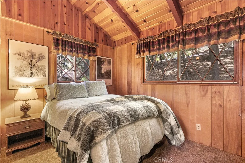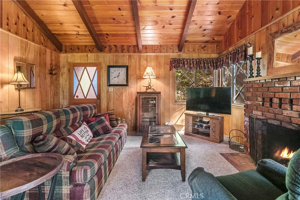 Set among the towering evergreen trees, this charming 3 bedroom, 1bathroom rustic cabin vibe, offers the perfect blend of seclusion and comfort. The cabin's warm and inviting open living space is ideal for gathering with family and friends, with high wood beam ceilings and a wood-burning fireplace. Step out onto the deck to enjoy the peaceful forest surroundings perfect for relaxing or outdoor dining. The lower level family room offers opportunity for more entertaining space that leads to back yard. This cabin is an ideal mountain retreat. Easy commuter location, close to Lake Arrowhead Village and Skypark at Santas Village. Come experience four-season tranquil mountain living.