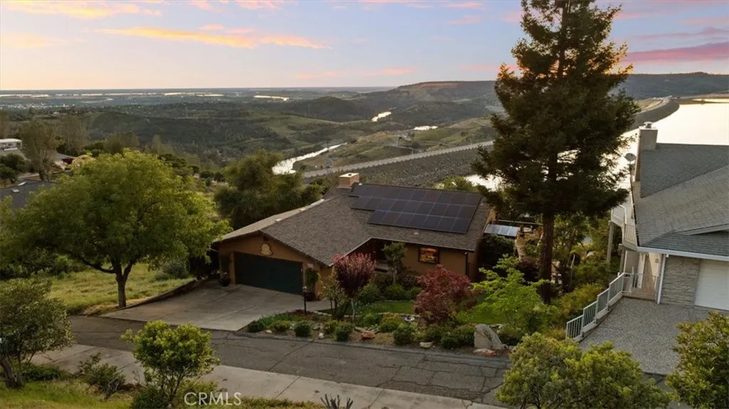 Welcome to one of the most breathtaking view properties in all of Butte County. Stunning 3 bedroom, 2.5 bathroom two-story home offering 2,262 sq ft of beautifully designed living space on a 9,148 sq ft lot with a 2-car attached garage. Priced at $274 per sq ft this is exceptional value for one of the most coveted view corridors in Northern California. Perched above Lake Oroville with Owned Solar and sweeping panoramic views of the lake and Northern Valley, this home delivers a front-row seat to nature's finest moments from morning light dancing across the water to unforgettable sunsets painting the sky every single evening. Step outside and you are surrounded by the best of outdoor living. With Bidwell Marina just minutes away, kayaking on Lake Oroville is a 10-minute decision. The Bidwell Spillway, Bebe Trail, and Kelly Ridge Point are right at your doorstep for walking and biking adventures, and the State Park sits directly behind the property offering endless trails and recreation year-round. The Oroville Dam is just a hop, skip and a jump away. Entertain in style with a beautifully appointed outdoor kitchen complete with built-in grill, garden area with shed, and a bocce ball court all framed by mature landscaping and a low maintenance yard designed for enjoyment not labor. Unwind in your private hot tub as the sun sets over the valley. Inside the open concept floor plan flows effortlessly with a large kitchen that captures the incredible lake and valley views from every angle. Tinted windows with sunshades keep the home comfortable while preserving those million dol