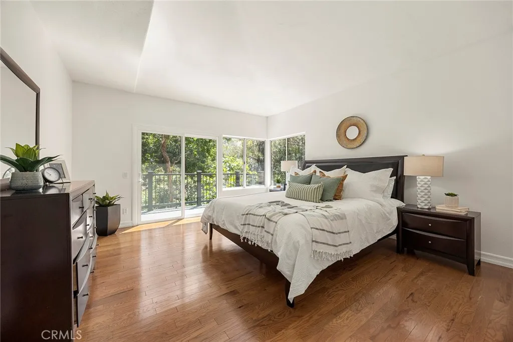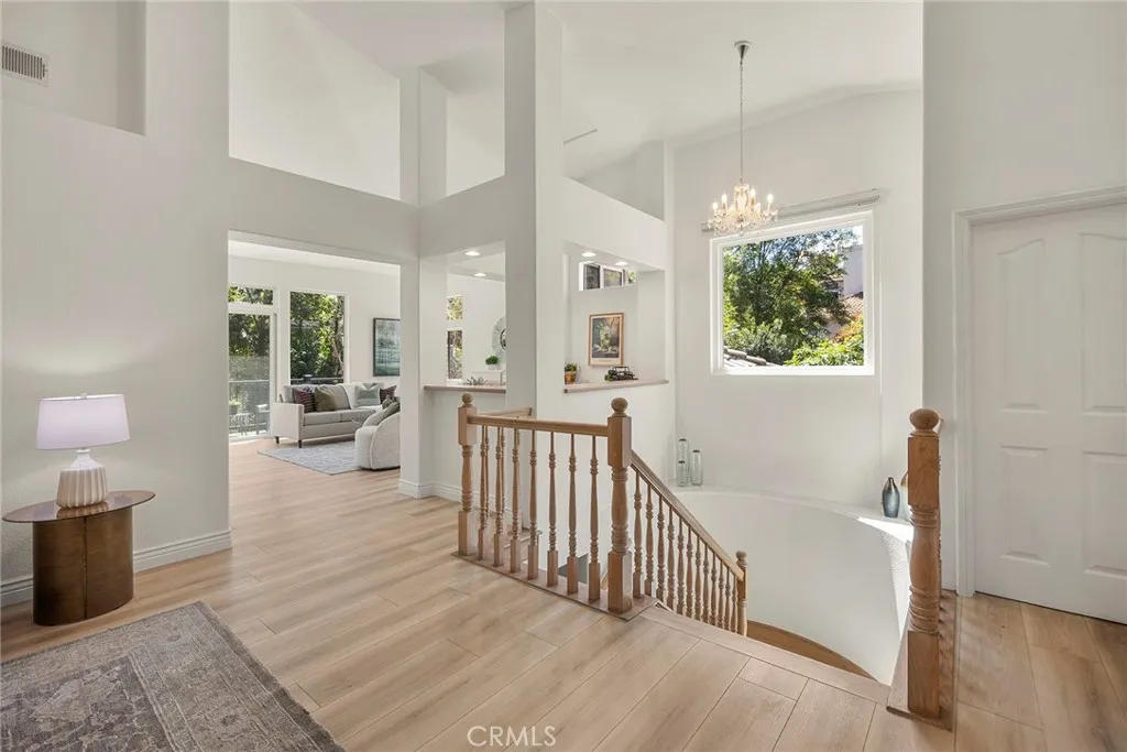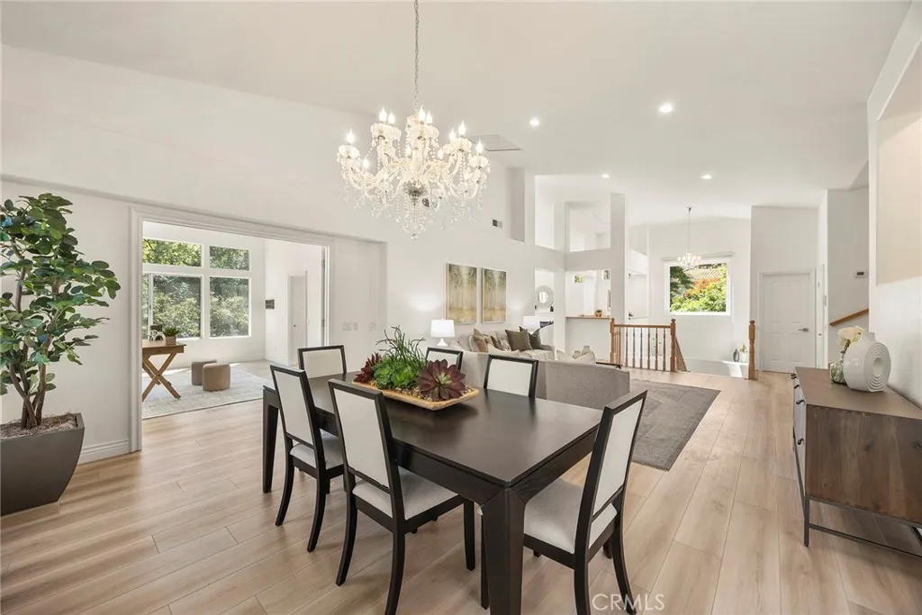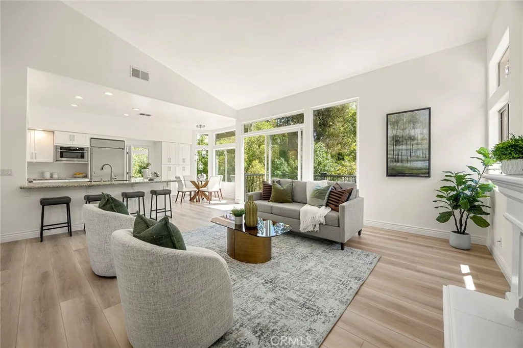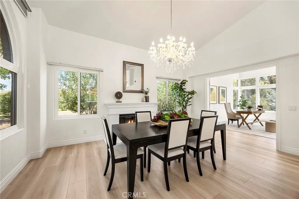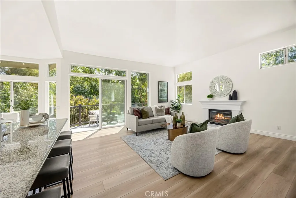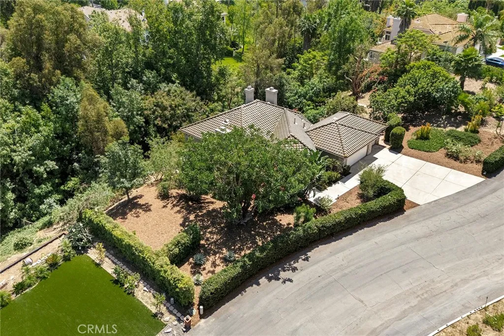 Nestled in beautiful forest like setting with PERFECT ADU POTENTIAL, this estate offers a cozy sanctuary where city life fades away and the beauty of nature takes center stage. Set on over a sprawling half-acre lot within the exclusive gated community of Royal Ridge, this exceptional 4-bedroom, 2.5-bath estate offers a rare blend of modern comfort and serene natural surroundings. Tucked away for ultimate privacy, the home delivers the peaceful feel of a secluded retreat while remaining just minutes from everyday conveniences. With over 180ft of street frontage, this becomes the ideal opportunity for a separate ADU, guest house or garages with its own approach. A striking custom double-door entry with operable glass panels welcomes you in, allowing fresh breezes to flow through the home. Inside, expansive walls of windows frame picturesque views of the surrounding landscape, filling the space with natural light and a seamless connection to nature. Rich hardwood flooring, crisp white walls, and soaring ceilings create an airy, sophisticated ambiance throughout the main living areas. The formal living room is anchored by a cozy fireplace, complemented by an elegant formal dining room ideal for entertaining. The updated kitchen shines with bright white shaker cabinetry, sleek granite countertops, and upgraded stainless steel appliances. Just beyond, the inviting family room features a second fireplace and a convenient wet bar, perfect for relaxed gatherings. Step outside through the sliding doors to a private view deck, where tranquil forest vistas become part of your everyday