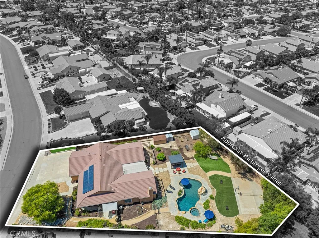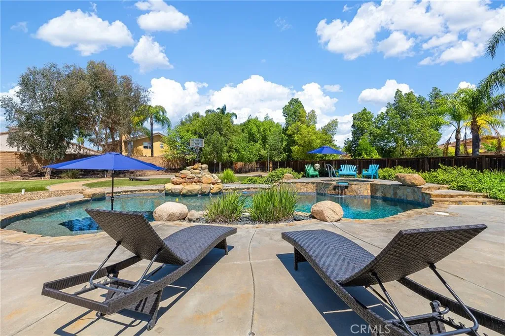 HALF-ACRE LOT, POOL & SPA, RV PARKING, SINGLE-STORY, SOLAR! Beautiful home in desirable West Murrieta neighborhood Murrieta Ranchos, situated on a .56 acre lot, open floorplan 3,084 square foot 4-bedroom plus theater room/ guest room, and 2.5 bathrooms. Formal Living & Dining rooms, huge kitchen open to the Family room, gas fireplace with raised hearth, spacious Primary Suite with ensuite bathroom; dual sinks, separate tub & shower, walk-in closet, and a doorway to the backyard. Hall bathroom has dual sinks & a separate shower area. Theater room also serves as a guest room, with a Murphy bed/ desk. Indoor laundry room with utility sink & plenty of cabinets. "Renewal by Anderson" Windows installed throughout in 2022. Wood-look porcelain tile flooring, plantation shutters, new carpet, new interior paint. Amazing yard with pebble-tech pool & spa, sport court, covered BBQ area with fridge, 2 gardens with raised garden beds, a large grassy area, gated RV parking, and 2 patio areas. House is equipped with 17 solar panels to lower energy costs. No HOA, and low taxes! This is a one-of-a-kind property!