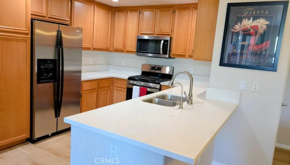Impressive two-bedroom, two-bathroom residence offers a comfortable and ample living accommodation. It has a large master bedroom with a spacious primary bathroom with dual sinks, a walk-in shower and a large walk-in closet. Storage space galore. This is a truly luxury condominium with a sizeable kitchen punctuated with relatively new stainless-steel appliances. It has been updated with all Carrara quartz counters in the kitchen and bathrooms. This unit includes a one car garage. This spectacular home has laminate, tile, and carpet flooring. There is a filtered water dispenser on the kitchen counter. No need to buy bottled water. It is punctuated with a modern LG front loaded washer and dryer tower. There are beautiful window shutters throughout with a roomy patio overlooking the complex and the gorgeous Santa Monica mountains. A 55- inch LG, OLED full motion wall mounted television is included with the sale of this unit. This Village at the Park community has a swimming pool, jacuzzi, a weight room, a patio with a BBQ and sink, as well as large gathering room that can be reserved for birthday parties and more. The complex is located next to the Pleasant Valley Fields a sports complex that is excellent for daily physical activities. Nearby there is a YMCA facility with a full array of programs for children and adults.